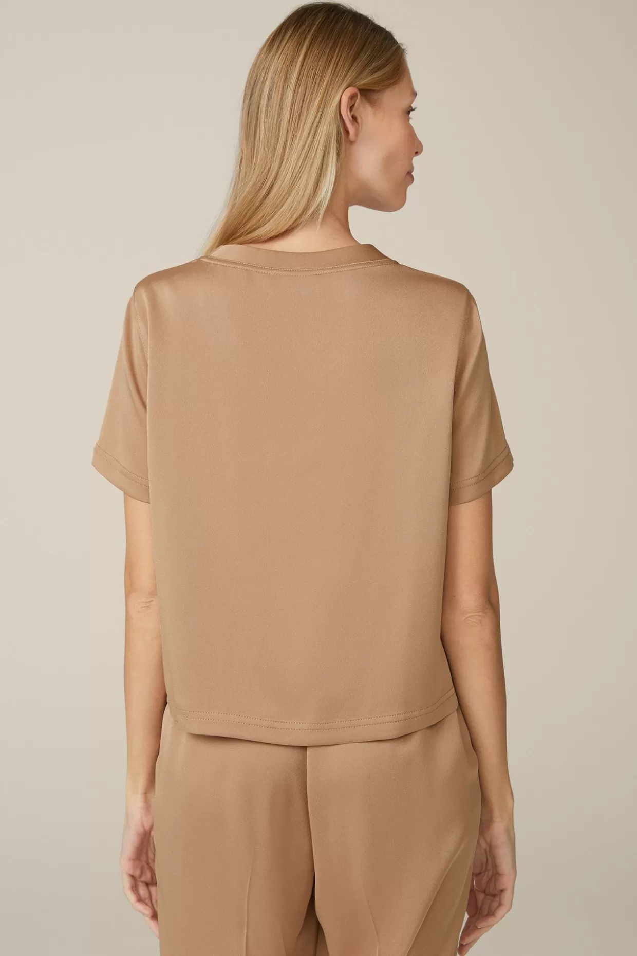 Feiner Japanese Crêpe Mit Seidigem Glanz-Effekt Zeichnet Das Luxuriöse Flair Des Kurzärmeligen Blusenshirts In Camel Aus Dem Hause Windsor Aus. Das Stilvolle Essential Überzeugt Im Komfortablen Schlupfdesign Und Erweist Sich Als Kombinationsstark – Zu Klassischen Looks, Souverän Mit Denims Und Elegant Als Allover-Style Mit Einer Crêpe-Hose.